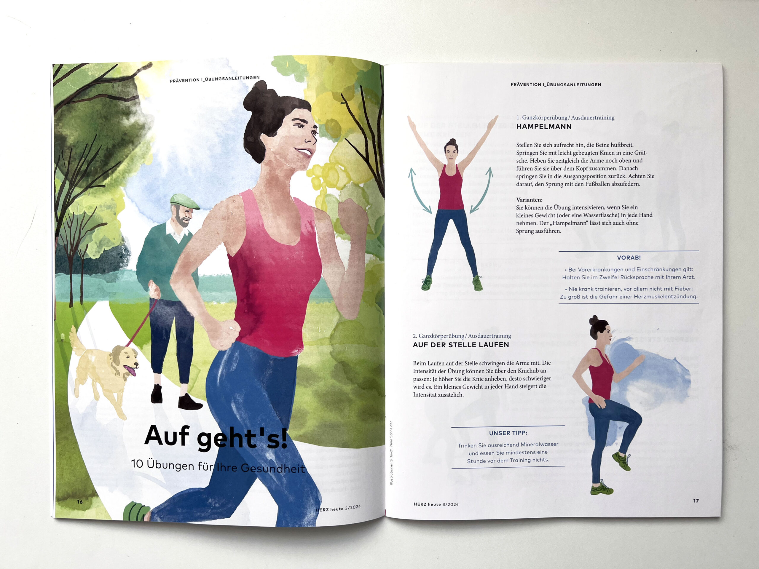 Illustrationen für das Magazin HERZ heute der Deutschen Herzstiftung e.V. zum Gesundheitsthema Bewegung: „10 Übungen für Ihre Gesundheit“